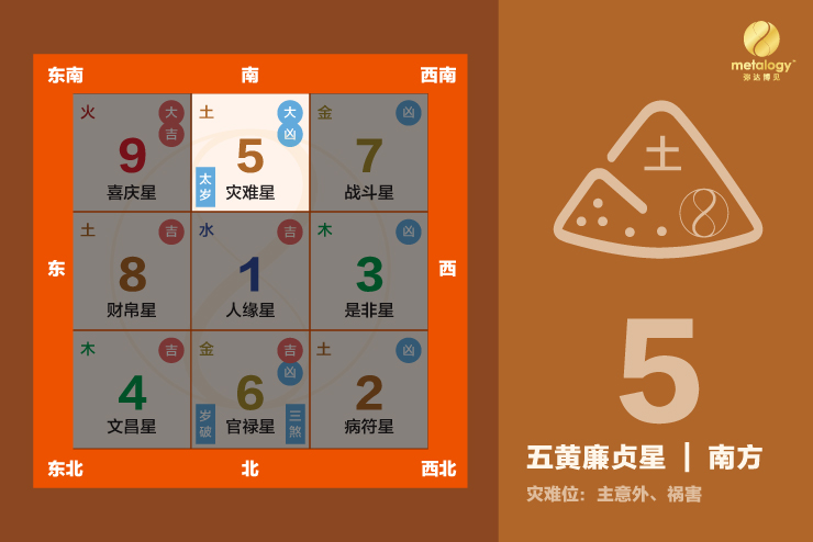 2026年丙午火年入局,九运火势盛极,火助土旺,令五黄煞气倍增。此星飞临正南离宫,火土相生,煞气亦随之而强,一旦被触动或扰动,将引发意外、病灾、官非与财耗等。此方位为流年大凶位,宜静不宜动,动则凶应。以金泄土、以静制煞,是今年南方护宅平安的关键。
