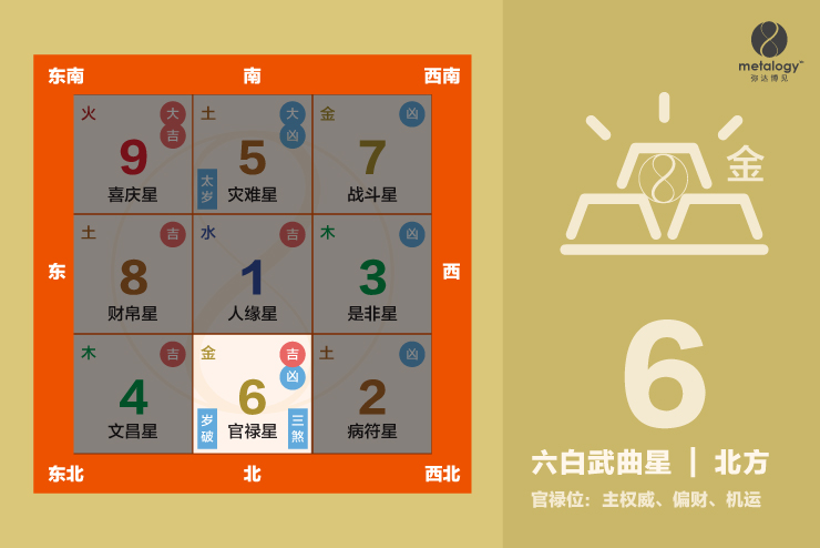 2026年此宫受“岁破、三煞”同临,气场不稳,容易引起破财、口舌或突发变动。六白武曲星飞临正北坎宫,原为贵人与财运之星,但火克金、水泄气,形成“动中藏机也藏危”之局。此方吉凶并存,稍有不慎易起波折。若能守中调气、化煞为势,平衡动静,则可在变动中得贵,在危机中见机。
